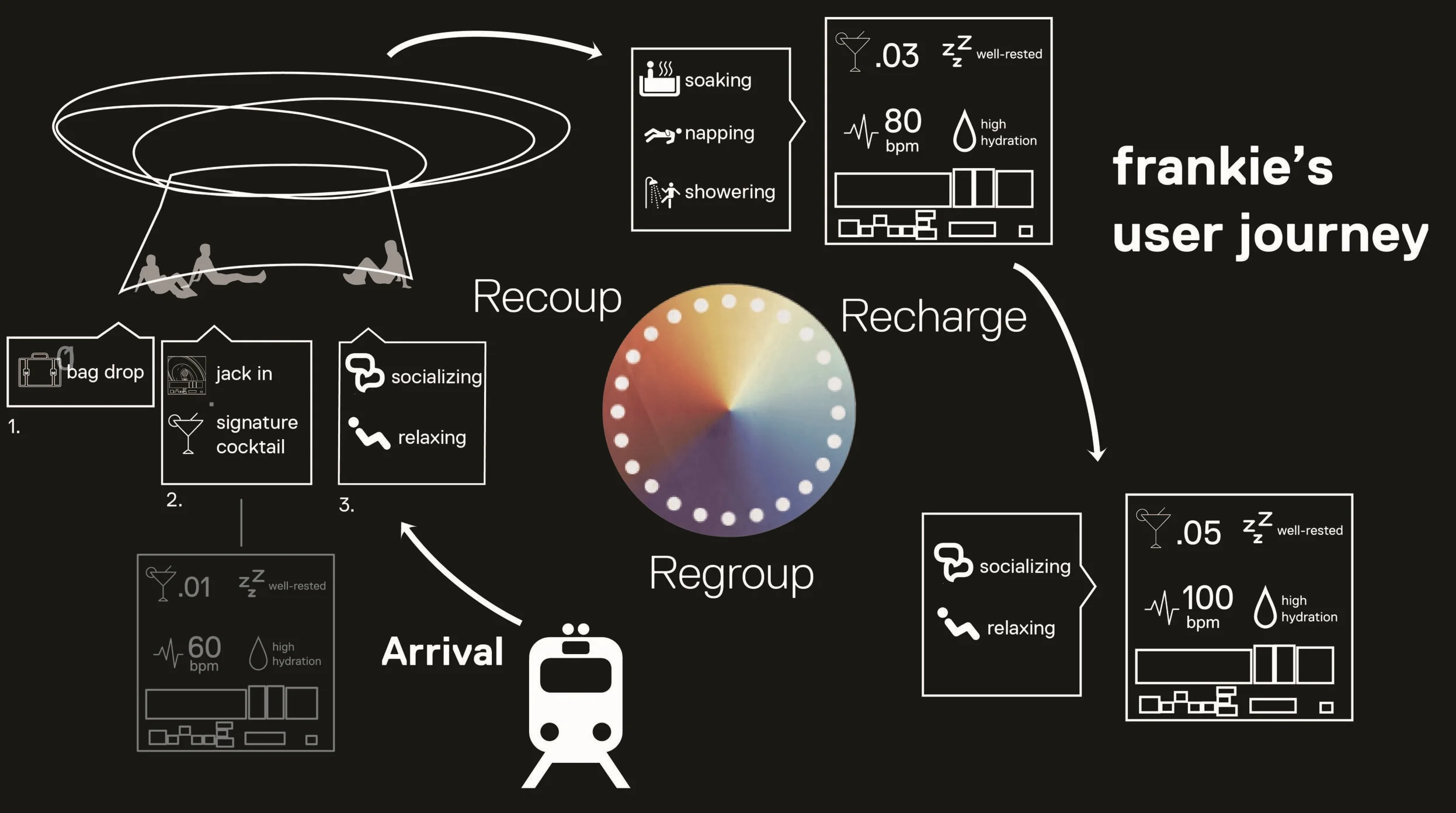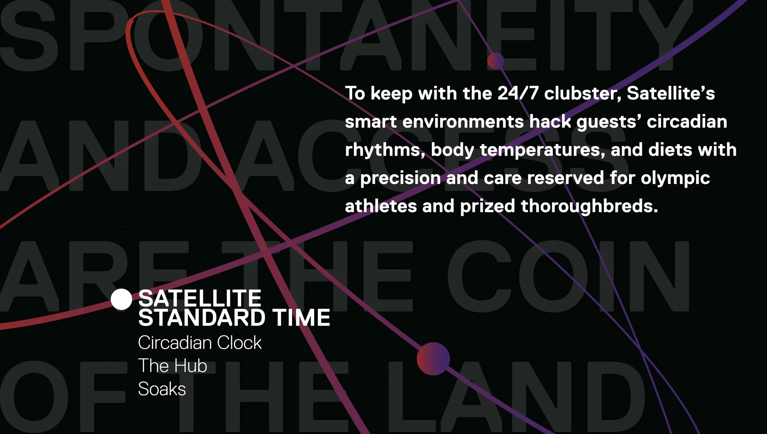 C. Circadian Lounge: This is a key moment in our space, the Circadian Lounge. The Circadian Clock is a connection point between all three levels. The orange glow is in effect marking the Recoup time period, and the space emitting a more mellow vibe. The seating creates a landscape for guests to rest and enjoy the Circadian Clock.